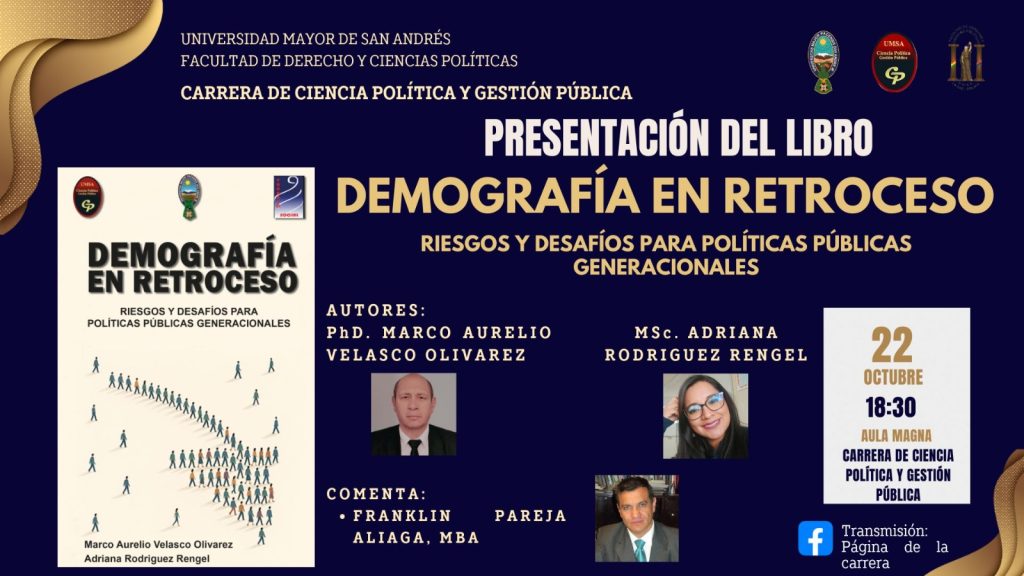 La Dirección de la Carrera de Ciencia Política y Gestión Pública realizó el pasado miércoles 22 de octubre, en el Aula Magna de la Carrera, la presentación del libro “Demografía en Retroceso: Riesgos y Desafíos para Políticas Públicas Generacionales”, en un evento académico de gran relevancia para el análisis de la realidad demográfica del país. La obra fue elaborada por el PhD. Marco Aurelio Velasco Olivarez y la MSc. Adriana Rodríguez Rengel, quienes abordaron los cambios poblacionales recientes y sus implicaciones en la formulación de políticas públicas orientadas a diferentes generaciones. El acto contó con la participación del MBA Franklin Pareja Aliaga como comentarista, quien destacó la importancia del texto como una herramienta de reflexión para la planificación estatal y la investigación social. La actividad se desarrolló de manera presencial, con la asistencia de docentes, estudiantes e invitados especiales, reafirmando el compromiso de la Carrera de Ciencia Política y Gestión Pública con la producción académica y el debate de temas estratégicos para el desarrollo del país.
