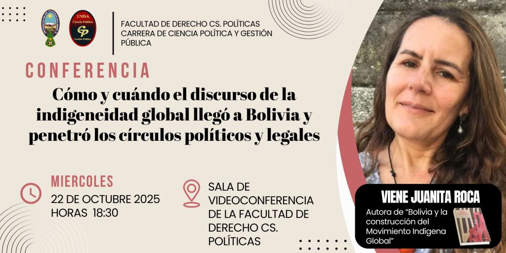 La Dirección de la Carrera de Ciencia Política y Gestión Pública llevó a cabo el pasado miércoles 22 de octubre de 2025 la conferencia titulada “Cómo y cuándo el discurso de la indigeneidad global llegó a Bolivia y penetró los círculos políticos y legales”, un evento académico que promovió el análisis crítico y la reflexión sobre los procesos de construcción del discurso indígena en el ámbito internacional y su incidencia en el contexto boliviano. La actividad contó con la participación de la destacada investigadora Juanita Roca, autora del libro “Bolivia y la construcción del Movimiento Indígena Global”, quien expuso los principales hallazgos de su obra y abordó la manera en que la narrativa de la indigeneidad se ha articulado con los procesos políticos y legales del país. La conferencia se desarrolló en la Sala de Videoconferencia de la Facultad de Derecho y Ciencias Políticas, con la presencia de docentes, estudiantes y público en general, quienes participaron activamente en un espacio de diálogo académico enriquecedor. Con esta actividad, la Carrera de Ciencia Política y Gestión Pública reafirma su compromiso con la formación crítica y la promoción de debates sobre temas de relevancia social, política y cultural, en el marco de su gestión académica 2025.