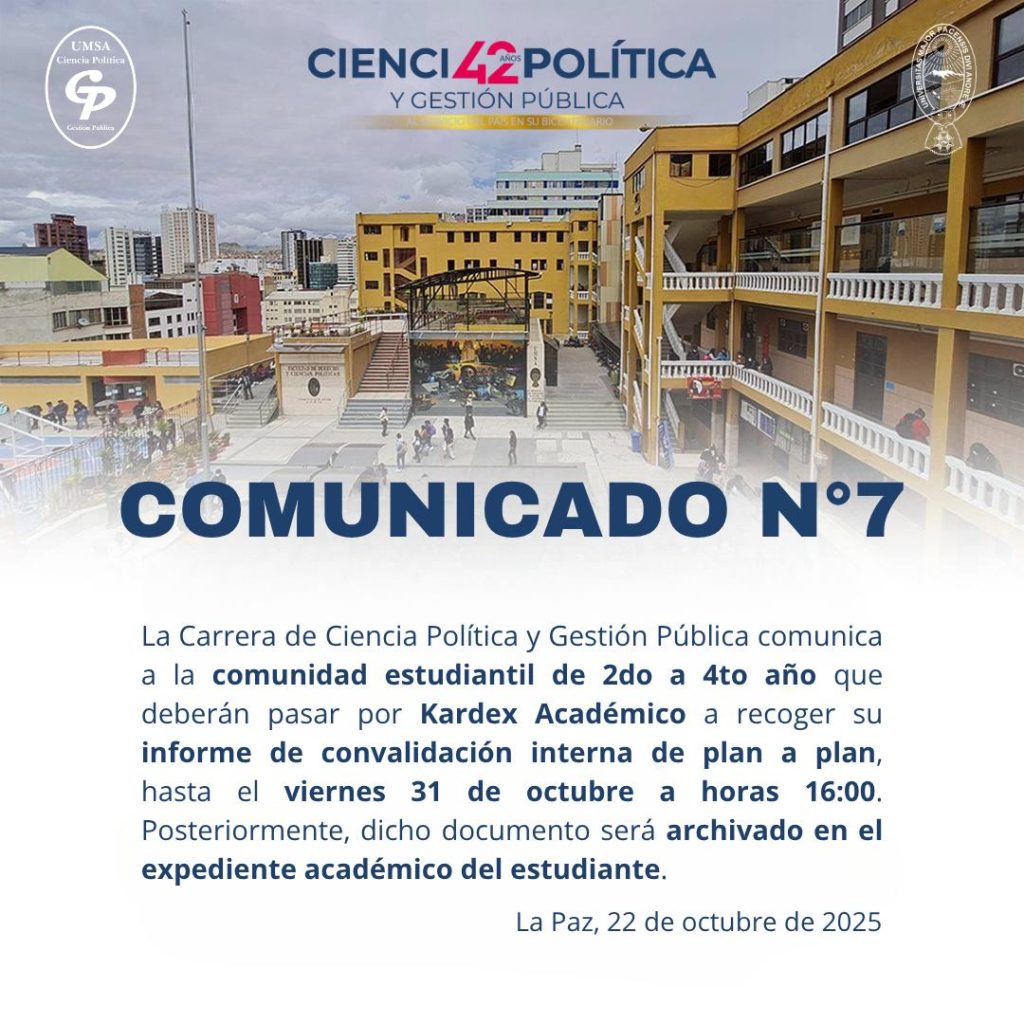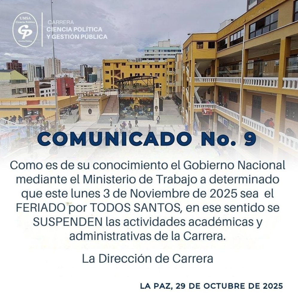 La Dirección de la Carrera de Ciencia Política y Gestión Pública informa a la comunidad universitaria que, en cumplimiento al comunicado emitido por el Rectorado de la Universidad Mayor de San Andrés, se establece que desde 𝗵𝗼𝘆, 𝗹𝘂𝗻𝗲𝘀 𝟐𝟕 𝗵𝗮𝘀𝘁𝗮 𝗲𝗹 𝘃𝗶𝗲𝗿𝗻𝗲𝘀 𝟑𝟏 𝗱𝗲 𝗼𝗰𝘁𝘂𝗯𝗿𝗲 𝗱𝗲 𝟮𝟬𝟮𝟱, la 𝗷𝗼𝗿𝗻𝗮𝗱𝗮 𝗹𝗮𝗯𝗼𝗿𝗮𝗹 𝘀𝗲 𝗱𝗲𝘀𝗮𝗿𝗿𝗼𝗹𝗹𝗮𝗿𝗮́ 𝗲𝗻 𝗵𝗼𝗿𝗮𝗿𝗶𝗼 𝗰𝗼𝗻𝘁𝗶𝗻𝘂𝗼. Agradecemos su comprensión y compromiso con el normal desarrollo de las actividades académicas.