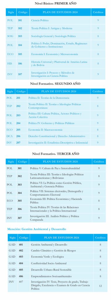 La Mención en Gestión Ambiental y Desarrollo tiene como propósito formar profesionales capaces de analizar, interpretar y gestionar de manera integral las problemáticas ambientales que enfrentan el Estado y la sociedad boliviana. Esta área de especialización articula conocimientos interdisciplinarios que combinan ecología política, gestión pública, economía ambiental y planificación sostenible, permitiendo que los futuros politólogos desarrollen competencias para intervenir en procesos de toma de decisiones orientados al desarrollo integral y la sostenibilidad.