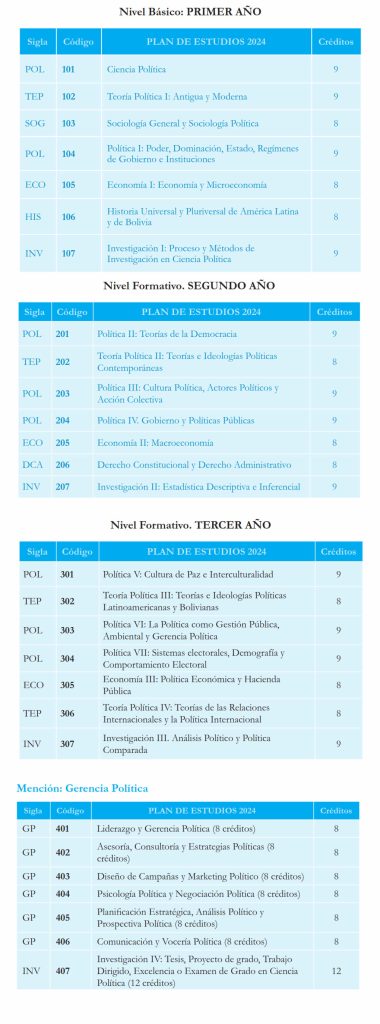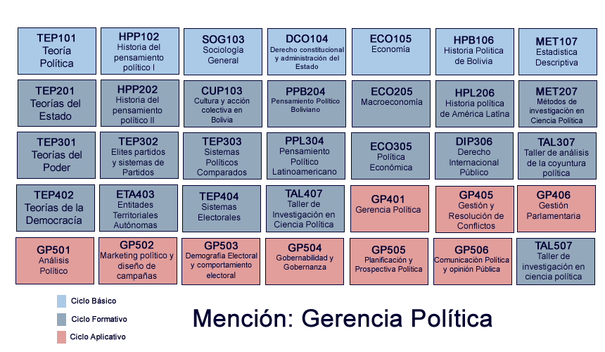 La Gerencia Política prepara a los politólogos para la dirección y gestión política en sus múltiples dimensiones. De manera especial, se sitúa en el campo de la toma de decisiones estratégicas en escenarios complejos, aprovechando el uso de las nuevas tecnologías políticas y de poder, así como en el análisis político desde una perspectiva gerencial y científica. El politólogo de esta mención comprende la configuración de la opinión pública y gestiona entornos de comunicación política, domina procesos de planificación estratégica, realiza prospectiva política, diseña campañas políticas, analiza escenarios electorales y cuenta con destrezas para orientar y gerenciar procesos de gobernabilidad y gobernanza